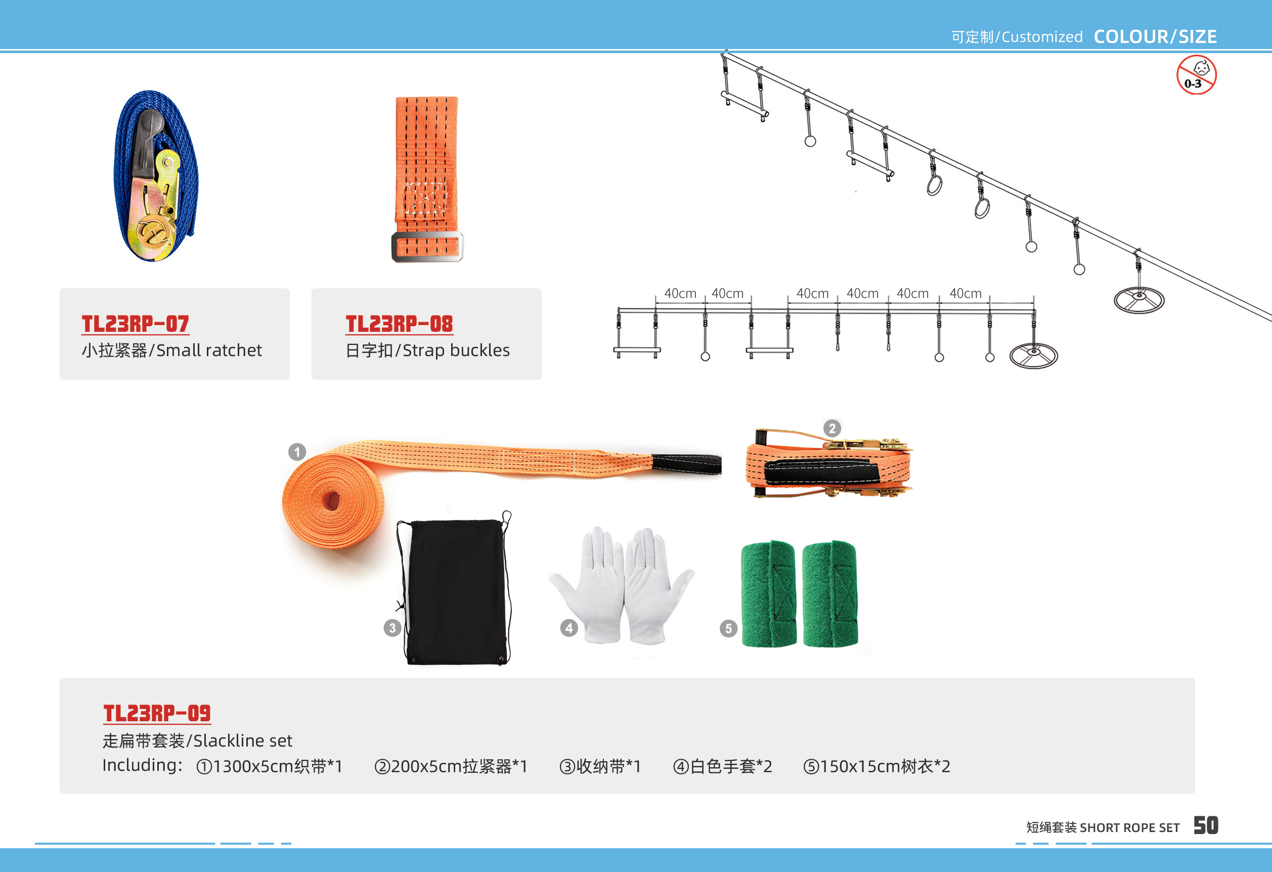 TL23RP-07小拉紧器/Small ratchetTL23RP-08日字扣/Strap bucklesTL23RP-09走扁带套装/Slackline setIncluding:①1300x5cm织带*1 ②200x5cm拉紧器*1 ③收纳带*1 ④白色手套*2 ⑤150x15cm树衣*2